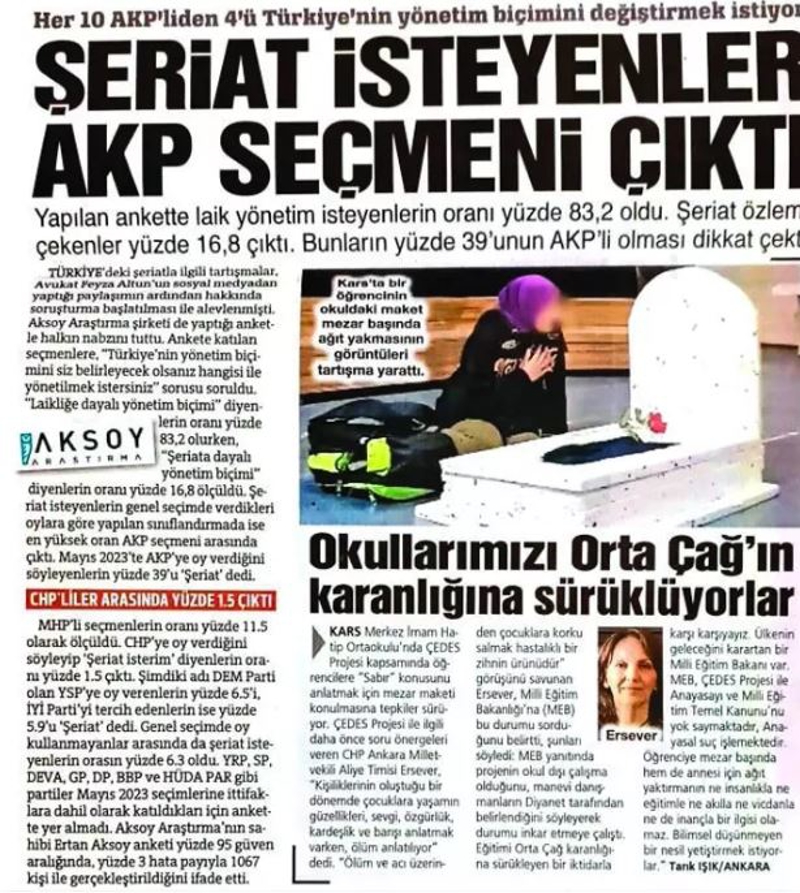 Türkiye'yi şeriat ve yabancı düşmanlığı ile kutuplaştırmaya çabalayan 'akıl', zeka düzeyini bir kez daha gösterdi. Aksoy Araştırma şirketinin yaptığı bir anket dün Sözcü gazetesinde "Her 10 AKP'liden 4'ü şeriat istiyor" başlığıyla yayınlandı. Habere göre ankette, "Nasıl bir yönetim biçimi istiyorsunuz?" sorusuna "Laikliğe dayalı" diyenler yüzde 83.2, "Şeriata dayalı" diyenler ise yüzde 16.8 çıktı. Yüzde 16.8'in partilere göre dağılımında ise yüzde 39 ile AK Parti seçmeni ilk sırada yer aldı. Ankette yer alan bu veri, haberde "Her 10 AK Partili'den 4'ü yönetim biçimini değiştirmek istiyor" yorumuyla verildi.