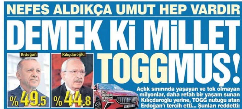 Henüz ikinci tur seçimleri yapılmamışken aşağılayıcı bir dile bürünen Sözcü gazetesi, manşetin devamında şu ifadeleri kullandı: Açlık sınırında yaşayan ve tok olmayan milyonlar, daha refah bir yaşam sunan Kılıçdaroğlu yerine, Togg nutuğu atan Erdoğan'ı tercih etti.