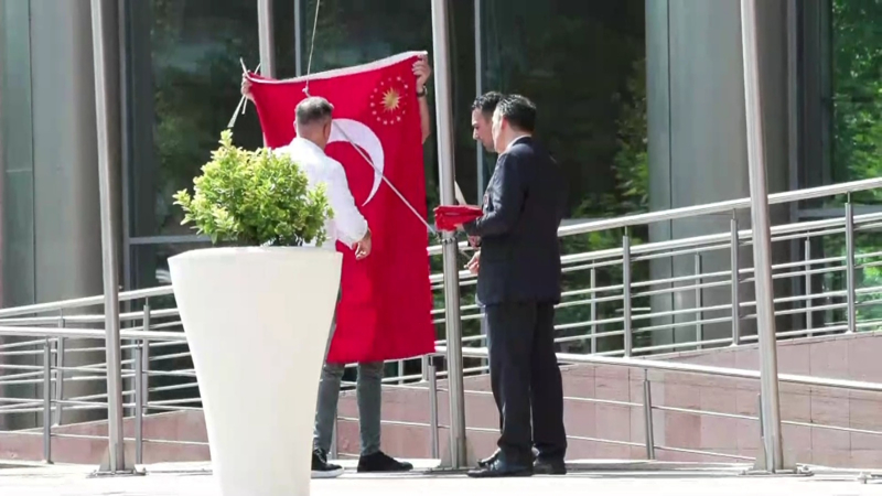 Öte yandan, CHP Genel Merkezinin önündeki bayraklar arasına, Erdoğan'ın ziyareti dolayısıyla Cumhurbaşkanlığı forslu bayrak da asıldı.