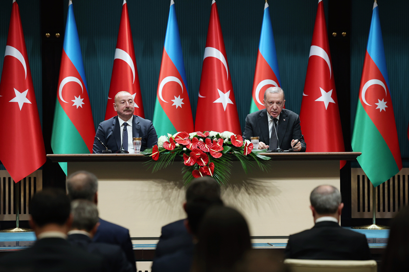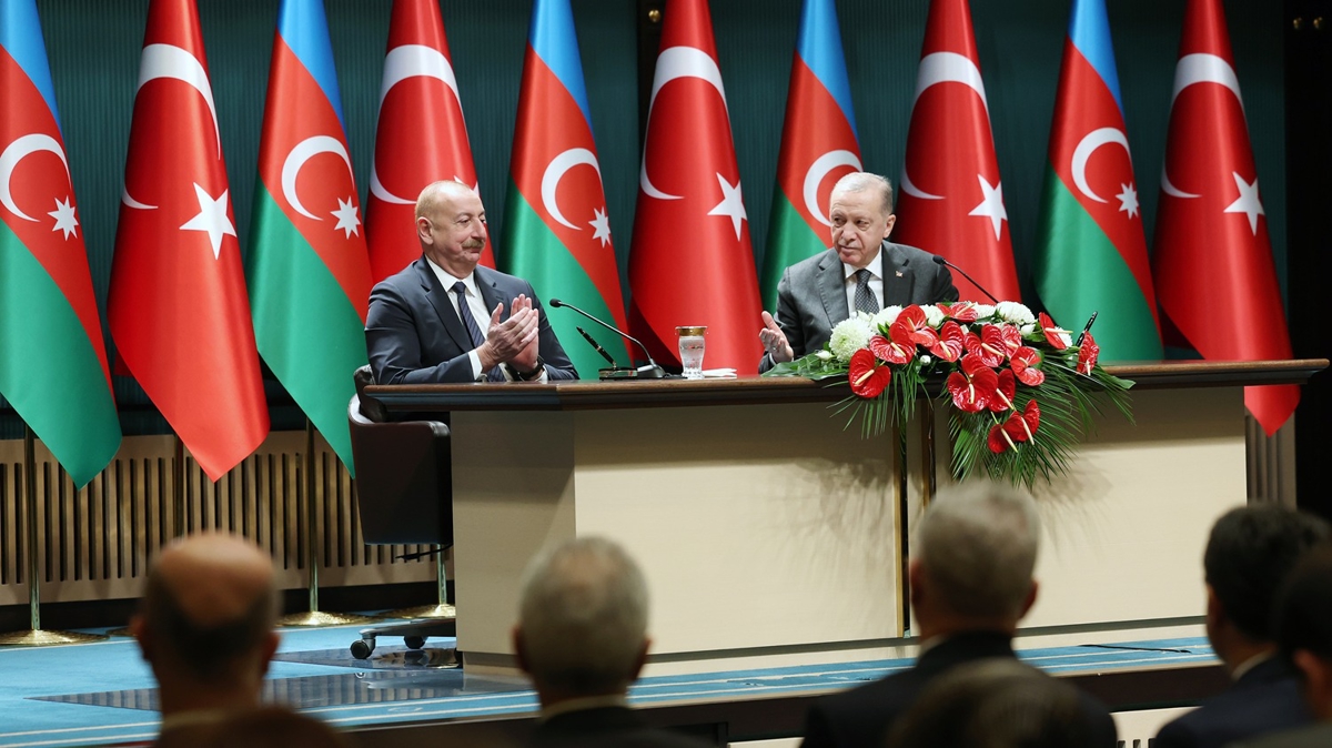 Cumhurbaşkanı Erdoğan, Cumhurbaşkanlığı Külliyesi'nde, Azerbaycan Cumhurbaşkanı İlham Aliyev ile baş başa ve heyetler arası görüşmesinin ardından ortak basın toplantısında konuştu.
