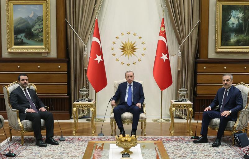 Cumhurbaşkanlığı Külliyesi'nde basına kapalı gerçekleştirilen kabulde, Dışişleri Bakanı Hakan Fidan da yer aldı.
