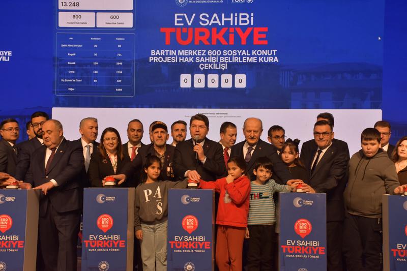 Bartın Üniversitesi konferans salonunda "Yüzyılın Konut Projesi" kapsamında Bartın'da inşa edilecek 1620 sosyal konutun hak sahipleri için düzenlenen "Ev Sahibi Türkiye Kura Çekiliş Töreni"nde konuşan Tunç, bugün, 3 yıl önce 6 Şubat Depremleri'nde yerle bir olan 11 ilde 455 bin konutu 2,5 yılda inşa eden ve ülke genelinde de 500 bin sosyal konutu açıklayarak vatandaşlarını ev sahibi yapmak isteyen bir Türkiye olduğunu söyledi.