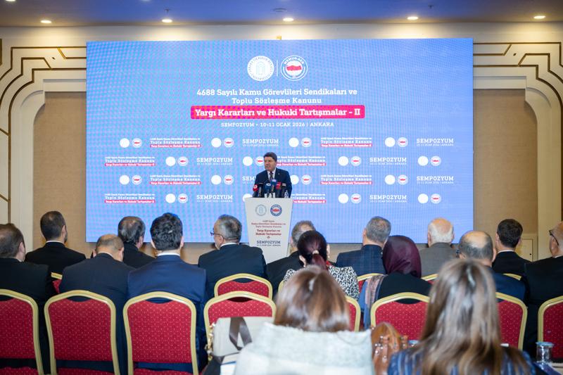 Tunç, Memur-Sen ile Ankara Yıldırım Beyazıt Üniversitesi işbirliğinde Kızılcahamam'daki otelde düzenlenen "4688 Sayılı Kamu Görevlileri Sendikaları ve Toplu Sözleşme Kanunu-Yargı Kararları ve Hukuki Tartışmalar" Sempozyumu'nda konuştu.