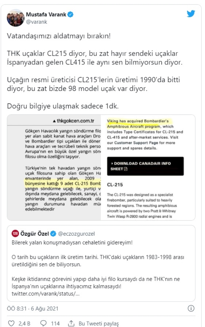 "Vatandaşımızı aldatmayı bırakın!" diyerek bir paylaşımda bulunan Varank, "Uçağın resmi üreticisi CL215'lerin üretimi 1990'da bitti diyor, bu zat bizde 98 model uçak var diyor." diyerek konuya ilişkin bilgiler paylaştı.