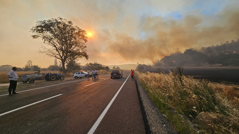 "An itibarıyla uçaklarımız, helikopterlerimiz, insansız hava araçlarımız, arazözlerimiz, iş makinelerimiz de dahil olmak üzere, AFAD, Valilik, diğer kamu kurumları hatta özel sektördeki bazı kurumların da katılımlarıyla yaklaşık 300 araç sayısına ulaştık ve 1000'e yakın arkadaşımız da dünden itibaren bu yangınla mücadeleyi gerçekleştirmiş oldu. Yangından etkilenen alan 575 hektar. Yanan alandan bahsetmiyorum, yangından etkilenen alandan bahsediyorum. Arkadaşlarımız, bütün her şey bittikten sonra ne kadar alanın hasar gördüğünü ayrıca yayınlayacaklar, her zaman olduğu gibi. Yaklaşık 340 hektar alan ormanlık, geri kalanı da orman dışı kırsal alan."