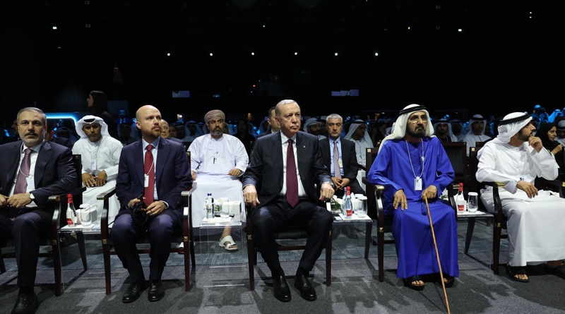 Cumhurbaşkanı Erdoğan'a konuşma yapacağı salona gelişinde BAE Başbakanı ve Dubai Emiri Şeyh Muhammed bin Raşid Al Mektum eşlik etti.