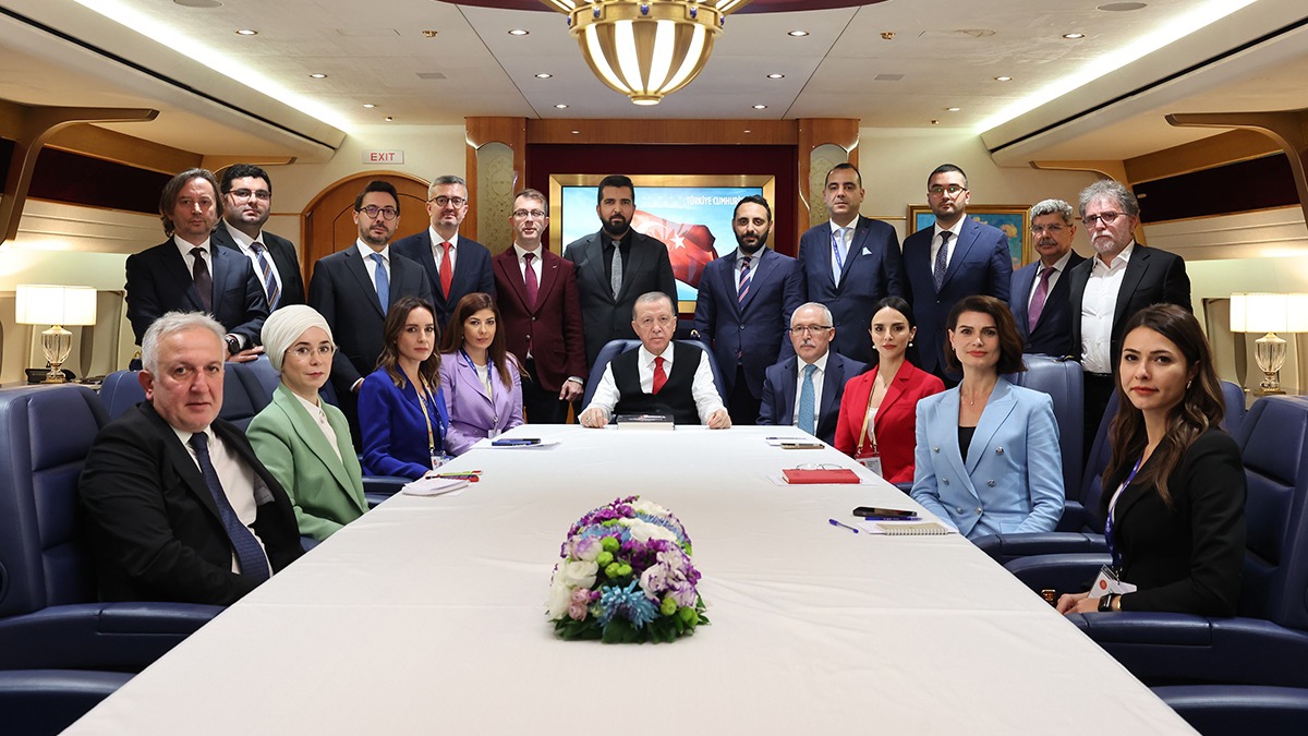 Cumhurbaşkanı Recep Tayyip Erdoğan BAE ziyareti dönüşü uçakta aralarında 24 TV Program Müdürü Zeynep Türkoğlu ve Akşam Gazetesi Yazarı Turgay Güler'in de olduğu gazetecilerin sorularını cevaplandırdı, değerlendirmelerde bulundu.