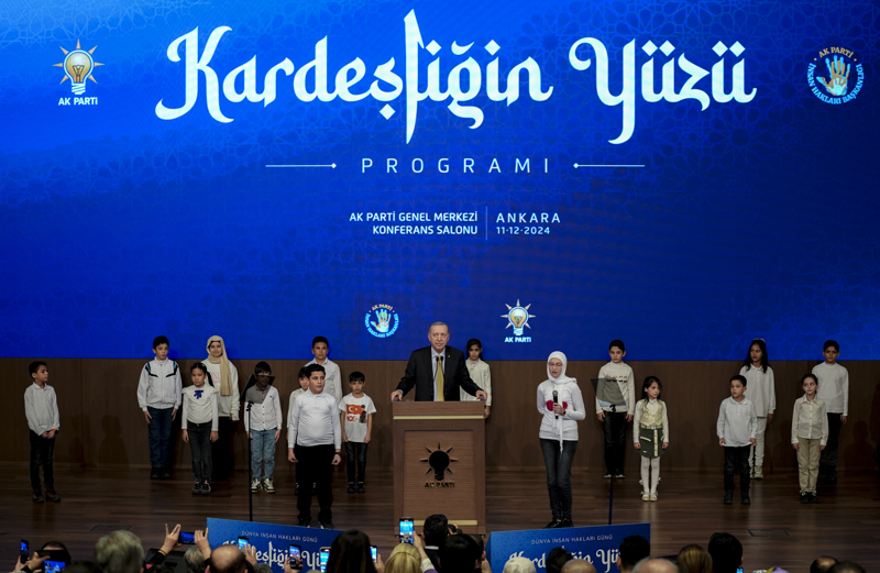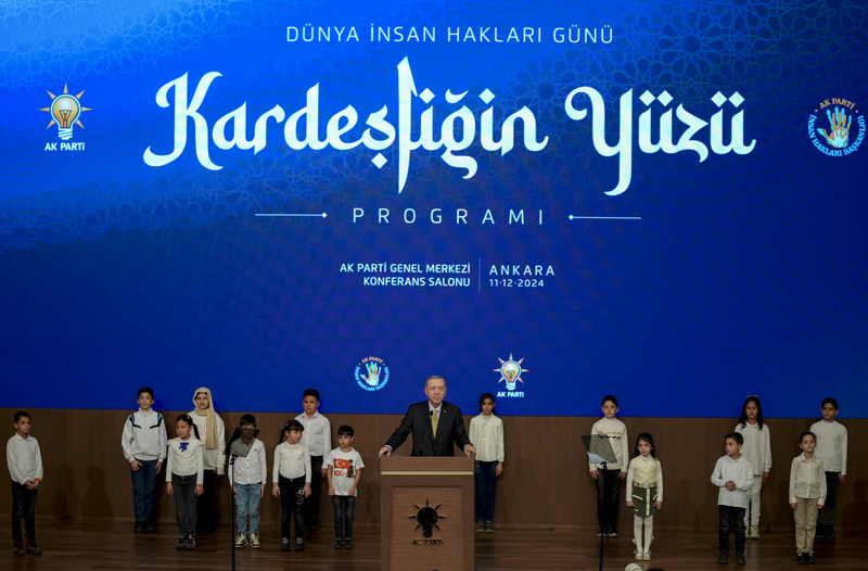 Cumhurbaşkanı Erdoğan, AK Parti Konferans Salonu'nda düzenlenen Dünya İnsan Hakları Günü Kardeşliğin Yüzü Programı'nda yaptığı konuşmada, bölgede ve dünyanın farklı köşelerinde ümidini Türkiye'ye bağlamış, kaderini Türk milletinin istikbaliyle birleştirenlere selamlarını gönderdi.