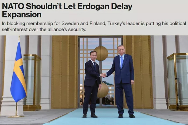 ABD merkezli Bloomberg'de, "NATO, Erdoğan'ın genişlemeyi geciktirmesine izin vermemeli" başlıklı bir yazı kaleme alındı. Makalede, Türkiye'ye İsveç ve Finlandiya'dan talepleri nedeniyle "kafa tutan ülke" benzetmesi yapıldı.