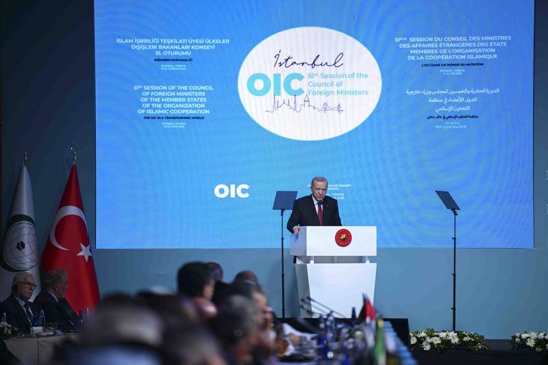 Cumhurbaşkanı Erdoğan, Lütfi Kırdar Kongre Merkezi'nde gerçekleştirilen İslam İşbirliği Teşkilatı (İİT) 51. Dışişleri Bakanları Konseyi Toplantısı'nda yaptığı konuşmada İslam dünyasının temsilcileriyle İstanbul'da bir araya gelmekten bahtiyarlık duyduğunu söyledi.