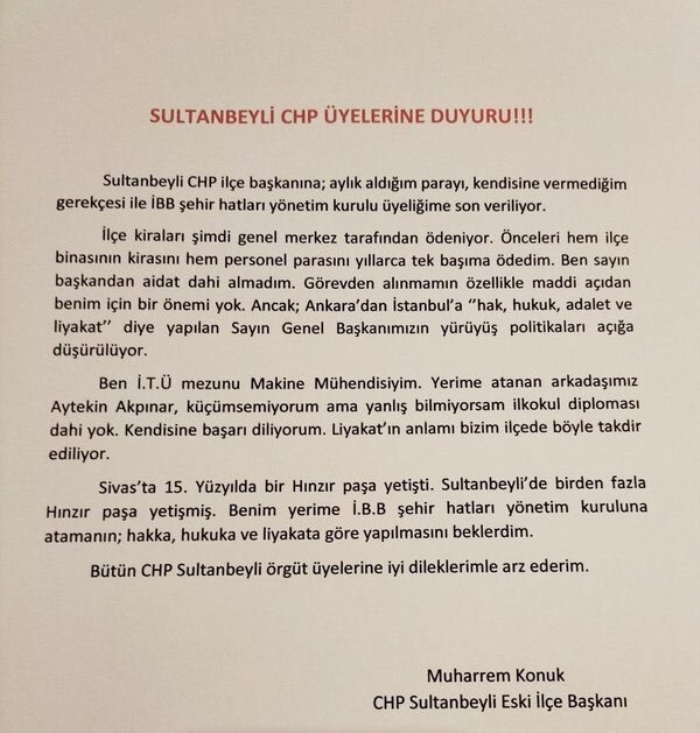 CHP Sultanbeyli Eski İlçe Başkanı Muharrem Konuk, yaptığı açıklamayla, partisinin ilçe yönetimi hakkında oldukça ses getirecek iddialarda bulundu.