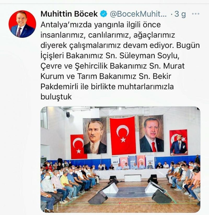 Böcek'in üç gün önce Twitter hesabından yaptığı paylaşımda "Antalya'mızda yangınla ilgili önca insanlarımız, canlılarımız, ağaçlarımız diyerek çalışmalarımız devam ediyor. Bugün İçişleri Bakanımız Sn. Süleyman Soylu, Çevre ve Şehircilik Bakanımız Sn. Murat Kuru ve Tarım Bakanımız Sn. Bekir Pakdemirli ile birlikte muhtarlarımızla buluştuk." yazdığı görüldü.