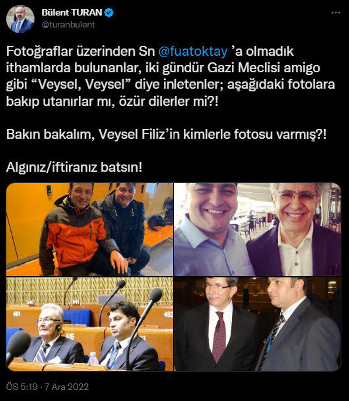 CHP'lilerin fotoğraf üzerinden algı yaptığını belirten Turan, "Fotoğraflar üzerinden Sayın Fuat Oktay'a olmadık ithamlarda bulunanlar, iki gündür Gazi Meclisi amigo gibi "Veysel, Veysel" diye inletenler; aşağıdaki fotoğraflara bakıp utanırlar mı, özür dilerler mi?! Bakın bakalım, Veysel Filiz'in kimlerle fotosu varmış?! Algınız/iftiranız batsın!"