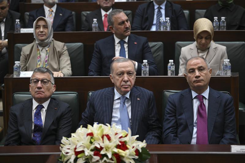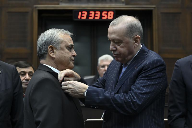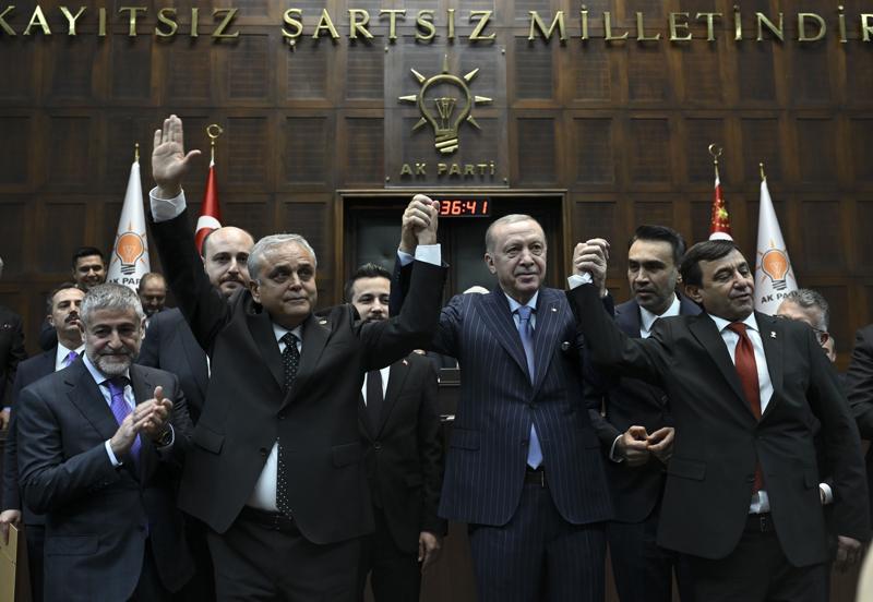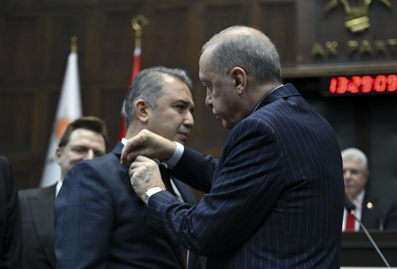 Cumhurbaşkanı Erdoğan'ın konuşmasının ardından AK Parti'ye katılan, Mersin Milletvekili Hasan Ufuk Çakır, Kahramanmaraş Milletvekili İrfan Karatutlu ve İstanbul Milletvekili İsa Mesih Şahin'e rozetlerini taktı.