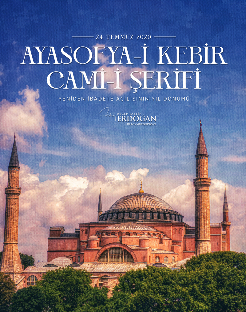 Cumhurbaşkanı Erdoğan, sosyal medya hesabı X'teki mesajında, "İstanbul'un Fethi'nin sembolü olan Ayasofya-i Kebir Cami-i Şerifimizin Fatih Sultan Mehmet Han'ın vakfiyesine uygun şekilde yeniden ibadete açılış yıl dönümünü tebrik ediyorum. Allah'a hamdolsun, Ayasofya'nın dirilişi tekrar hayırlı olsun." ifadelerini kullandı.