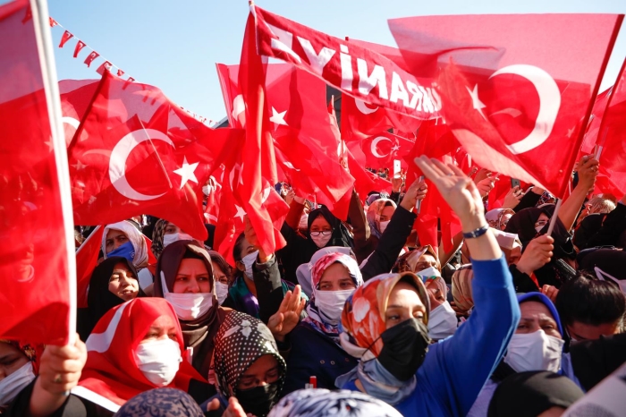 Allah'ın yardımı ve milletin desteğiyle Cumhuriyet tarihinde yapılanın tamamını 5'e, 10'a katlayan eser ve hizmetlere imza attıklarını belirten Erdoğan, "Türkiye'nin itibarını ve gücünü, diplomasiden askeri başarılara kadar geniş bir alanda dost ve düşmana kabul ettirdik. İHA'larımızla SİHA'larımızla Akıncı'larımızla evvelallah her yerde varız. Libya'da varız, Azerbaycan'da varız, Karabağ'da varız, varız da varız. Suriye'de terör örgütüyle mücadelemizi veriyoruz. Suriye'de terör örgütüyle mücadele verirken, Bay Kemal Suriye'yle ahbaplık yapıyor. Bay Kemal, sen Suriye'deki teröristlerle beraber ol, PKK'yla YPG'yle beraber ol, PYD'yle beraber ol, onları da gömeceğiz." diye konuştu.