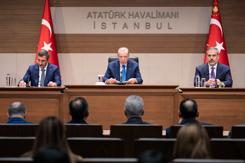 "Suriye'deki gerilimin artık sona ermesi gerektiğini, oradaki istikrarsızlığın başta terör örgütleri olmak üzere, tabii İsrail'in bir devlet terörü estirdiğini çok açık net ortaya koyacağız. Bu artık sıradan bir basit terör değil, devlet terörü. Bunu bugüne kadar çok kez tekrar ettik, söyledik ama bazıları hala özellikle Batılı ülkeler bunu anlamamakta ısrar ediyor. Biz de söylemekte ısrar edeceğiz ve bunu özellikle de inşallah Birleşmiş Milletler'deki konuşmamda ifade edeceğim. Bu gerginliğin sona ermesi, Suriye topraklarının tamamında huzur ve istikrarın sağlanması için Türkiye ve Suriye'nin birlikte atabileceği adımlar, Şam yönetimini muhaliflerin bir süredir Suriye'de çatışmasızlığın sağladığını görüyoruz. Bu durum kalıcı çözüm için etkin bir kapı aralamak adına elverişli bir ortam sağlıyor. Suriye dışında milyonlarca insan vatanlarına dönmek için bekliyor. Biz bu konuda çağrımızı yaptık. Türkiye ile Suriye arasındaki ilişkilerin normalleştirilmesi için Beşar Esad ile görüşme irademizi de ortaya koyduk. Biz şimdi karşı taraftan cevap bekliyoruz. Biz buna hazırız. Halkı Müslüman iki ülke olarak artık bu birlikteliği, bu beraberliği bir an önce gerçekleştirelim istiyoruz. İki ülke ilişkilerinde yeni bir dönem de böylesi bir görüşme neticesinde inşallah başlar diye inanıyorum."