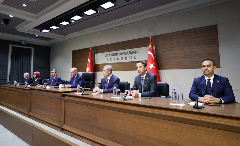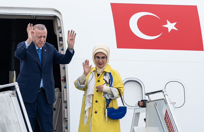 Cumhurbaşkanı Erdoğan'a eşi Emine Erdoğan, Aile ve Sosyal Hizmetler Bakanı Mahinur Özdemir Göktaş, Dışişleri Bakanı Hakan Fidan, Enerji ve Tabii Kaynaklar Bakanı Alparslan Bayraktar, Hazine ve Maliye Bakanı Mehmet Şimşek, Sanayi ve Teknoloji Bakanı Mehmet Fatih Kacır, Ticaret Bakanı Ömer Bolat, Milli İstihbarat Teşkilatı (MİT) Başkanı İbrahim Kalın, Cumhurbaşkanlığı İletişim Başkanı Fahrettin Altun, Cumhurbaşkanı Dış Politika ve Güvenlik Başdanışmanı Akif Çağatay Kılıç ve bazı yetkililer eşlik etti.