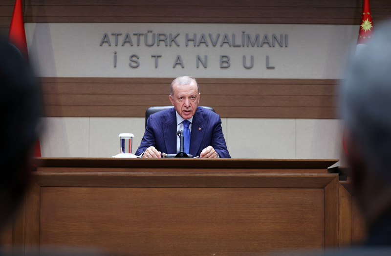 Cumhurbaşkanı Erdoğan, Birleşmiş Milletler (BM) 79. Genel Kurulu'na katılmak için ABD'ye gerçekleştireceği ziyaret öncesi Atatürk Havalimanı Devlet Konukevi'nde düzenlenen basın toplantısında konuştu.