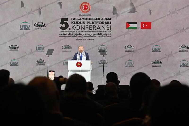 "Buradan, mücadeleleriyle Kudüs'le beraber tüm insanlığın onuruna da sahip çıkan Filistinli kahramanlara bir kez daha selamlarımı gönderiyorum. İşgalci zalimler karşısında dik duran Filistin'in yiğit evlatlarını ülkem ve milletim adına saygıyla selamlıyorum. Dünyanın dört bir yanında Filistin ve Gazzeli kardeşlerimizle dayanışma sergileyen, vicdan sahibi tüm insanlara teşekkür ediyorum. 7 Ekim'den (2023) bu yana yaşananları anlatmaya artık kelimeler yetersiz kalıyor. Modern dönem firavunlarını görmek isteyen hiç uzağa gitmesin, son 203 gündür 35 bin Filistinliyi acımasızca katledenlere baksın. Günümüzün Hitler'i ve Nazileri Gazze'de 15 binden fazla çocuğu öldüren katillerdir. Netanyahu kendisinden önceki caniler gibi adını 'Gazze Kasabı' olarak tarihe utançla yazdırmıştır. Alnına yapışan bu kara leke ne yaparsa yapsın çıkmayacaktır."