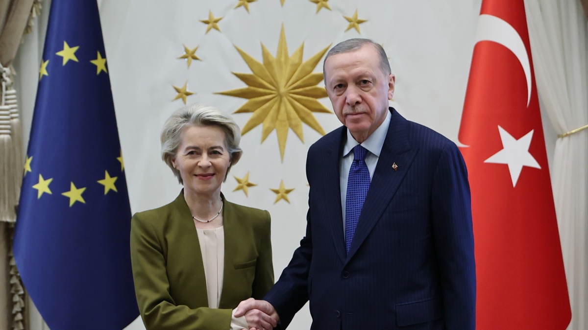 Erdoğan ve von der Leyen, merdivenlerde Türkiye ve Avrupa Birliği bayrakları önünde fotoğraf çektirdi.