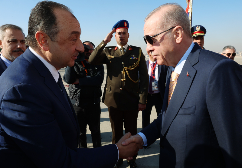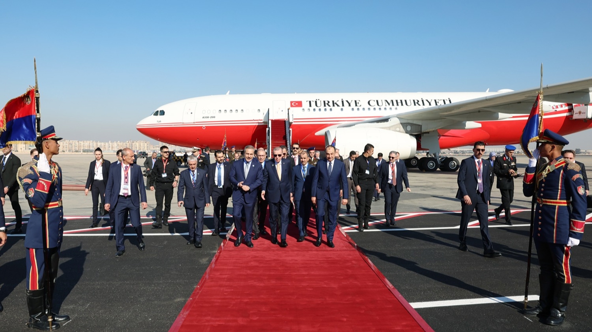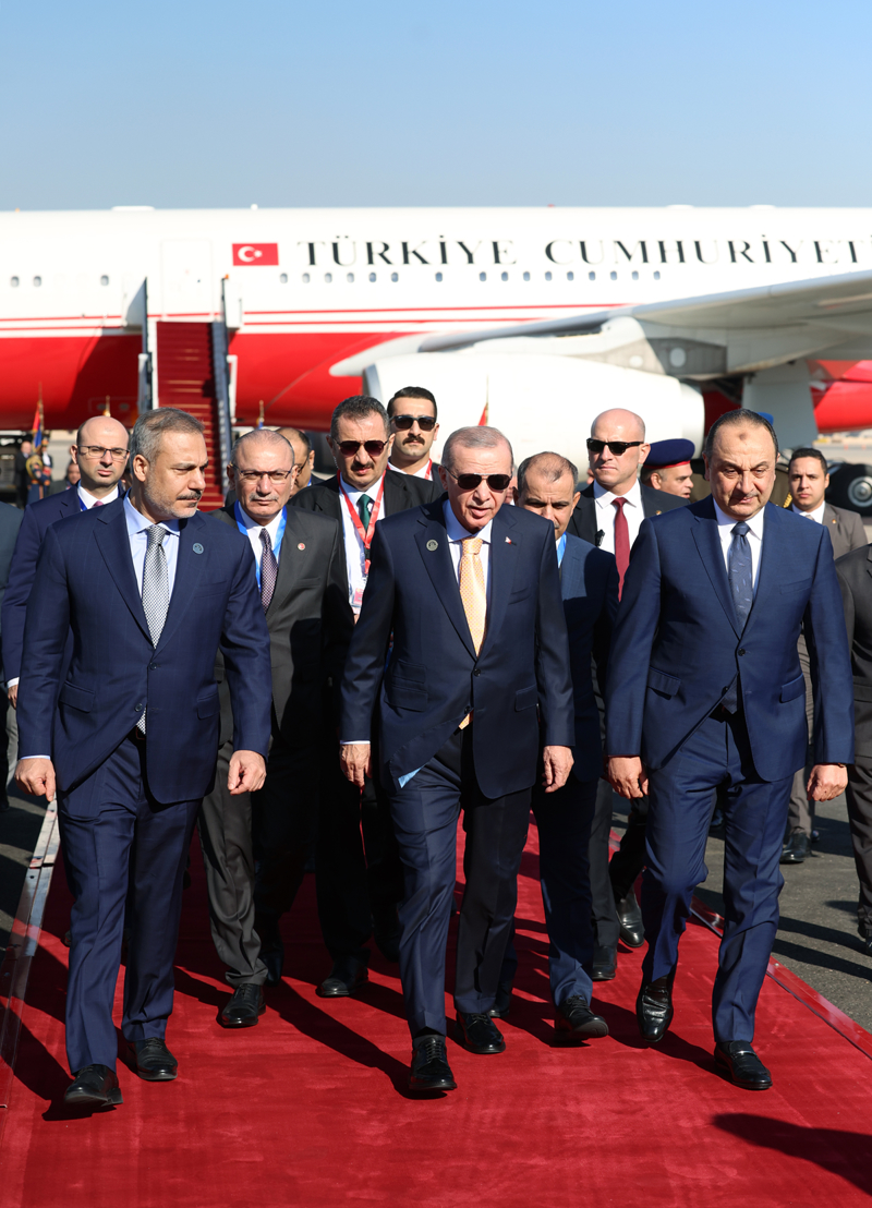 Cumhurbaşkanı Erdoğan'ı, Kahire Uluslararası Havalimanı'nda, Dışişleri Bakanı Hakan Fidan, Türkiye'nin Kahire Büyükelçisi Salih Mutlu Şen ve Mısırlı yetkililer karşıladı.