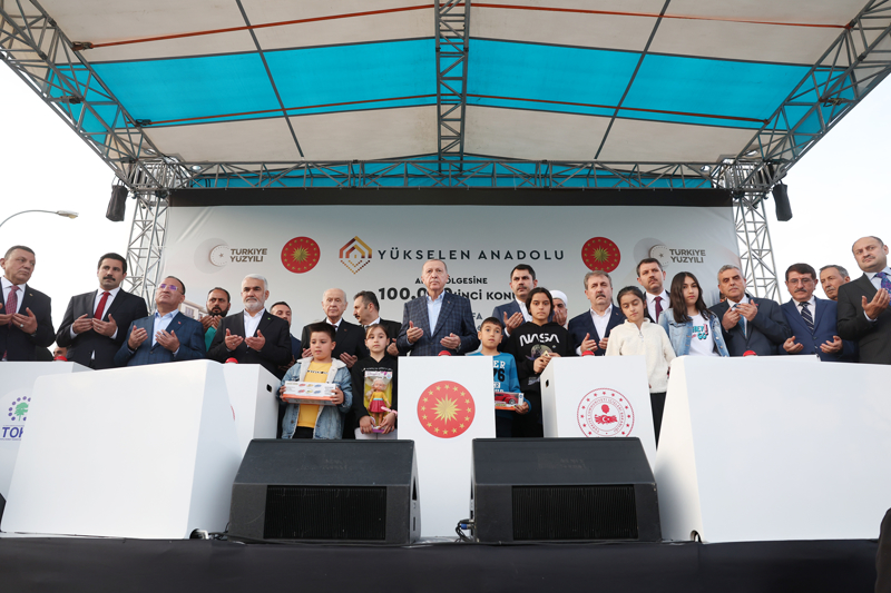 "Bu hissiyat ve şevkle 21 yılda ülkemize asırlık demokrasi ve kalkınma atılımları kazandırdık. Bu sayede yaşanan tüm felaketlerin izlerini rekor sürede silmeyi başardık. Bu anlayışla bilim insanlarınca 'asrın felaketi', yaşayanlar tarafından 'küçük kıyamet' olarak tarif edilen deprem yükünün altında kalmadık. Depremde yıkılan şehirlerimizi ayağa kaldırırken, sadece konut yapmakla da kalmıyoruz. Okuluyla, hastanesiyle, altyapısıyla, parkıyla, iş yerleriyle adeta yeni şehirler inşa ediyoruz. Bu kapsamda Şanlıurfa'mızda da 8 bini konut, 3 bini köy evi olmak üzere, 11 bin ev yaparak, depremzedelerimizi yeni yuvalarına kavuşturacağız. Şehirlerdeki konutları zemin artı 3 veya 4 kat, köy evlerini ise ahırı, bahçesi ve diğer kısımlarıyla tek kat olarak yapıyoruz. Her gün binlerce yeni konutun sözleşmesi yapılıyor, inşasına başlanıyor. Biz de deprem şehirlerimize yaptığımız ziyaretlerde yeni konut projelerimizin temellerini atıyor, daha önce tamamlananların da anahtarlarını teslim ediyoruz."