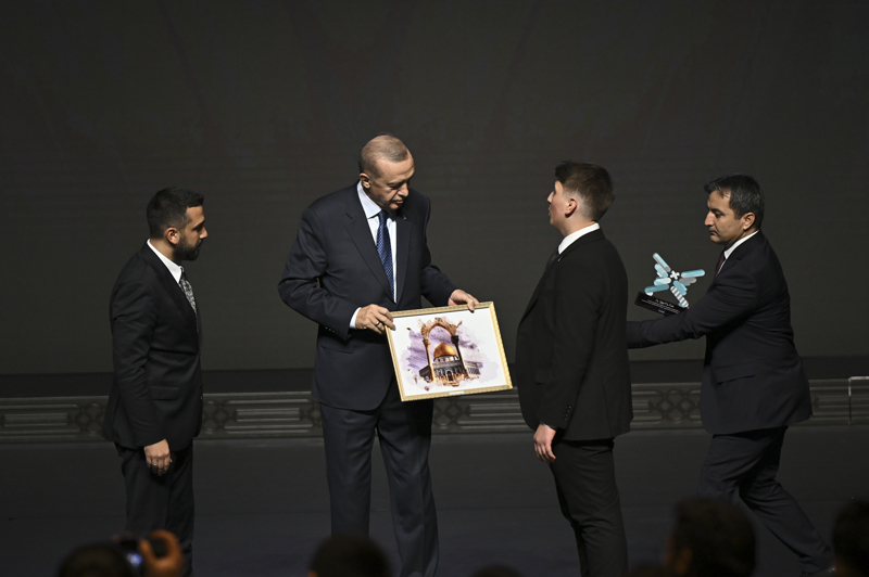 Mehmet Akif Ersoy'un "Zulmü alkışlayamam" şiirinden dizeler okuyan Erdoğan, "Biz de gönül coğrafyamızın tamamındaki olaylara ve gelişmelere bu zaviyeden bakıyoruz. Kim olursa olsun mazluma sahip çıkmayı, düşenin elinden tutup kaldırmayı, kanın gözyaşının ve katliamların önüne geçmeyi, doğru bildiklerimizi cesaretle haykırmayı, kimden gelirse gelsin, baskıya, tehdide boyun eğmemeyi, yani diklenmeden dik durmayı, mazlumlara, mağdurlara ve tüm insanlığa karşı öncelikli vazifemiz olarak görüyoruz. Sevgili genç kardeşlerim, asırlardır adalet ve hakkaniyetten sapmamış bir millet olarak, İsrail-Filistin geriliminde de tavrımız bu yöndedir."