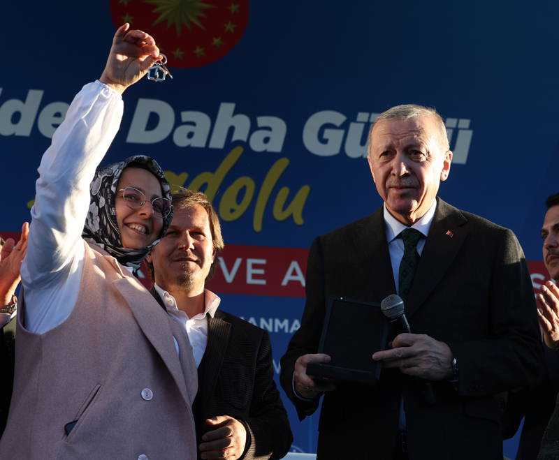 Eski CHP Genel Başkanı Kemal Kılıçdaroğlu'nun 14-28 Mayıs seçimleri öncesinde vatandaşlara "bedava konut" sözü verdiğini aktaran Erdoğan, "Madem bedava konut verebiliyorsunuz belediyeler aracılığıyla yapsanız ya? Elinizi tutan mı var? Halep oradaysa arşın burada, hadi buyurun yapın. Bunlar yapamazlar, bunlar millete hizmet edemezler. Bunlar para balyalarını yığma dışında, taş üstüne taş koyamazlar." dedi.