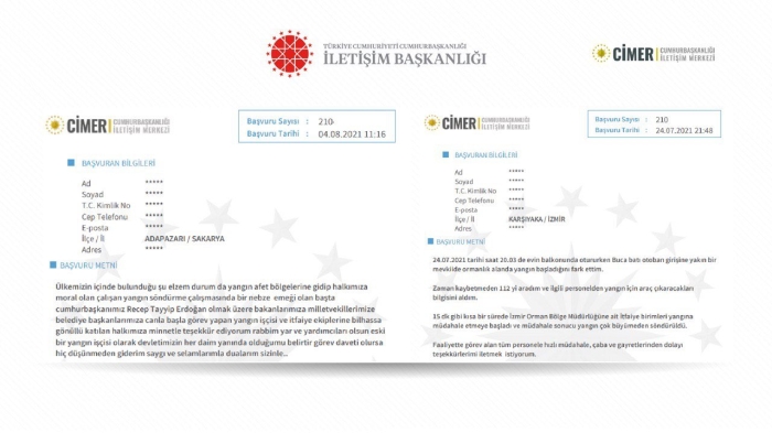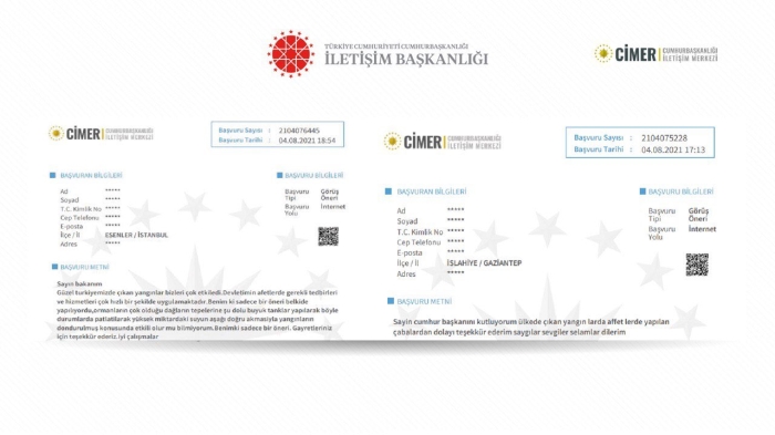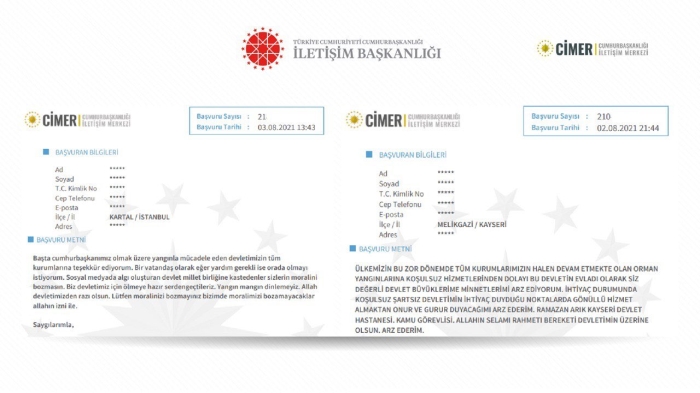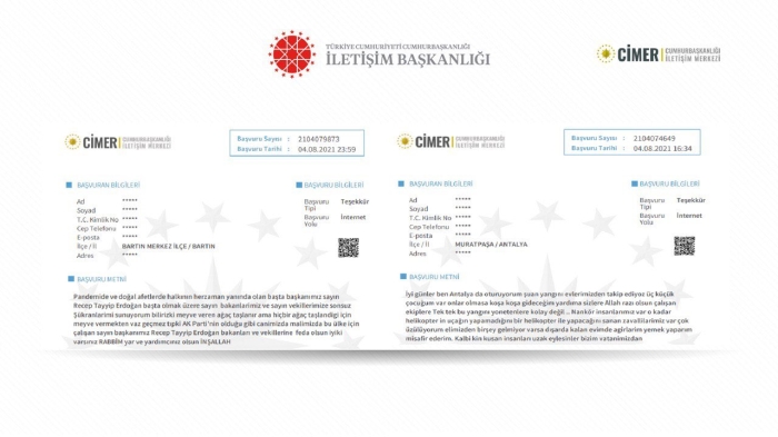 Antalya ve Muğla başta olmak üzere bazı bölgelerde devam eden yangınlarla mücadeleye ilişkin birçok vatandaş, Cumhurbaşkanlığı İletişim Merkezine (CİMER) destek mesajları gönderdi.