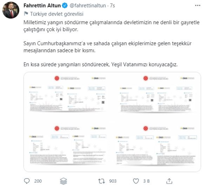 İletişim Başkanı Fahrettin Altun, Twitter hesabından yaptığı açıklamada, milletin, yangın söndürme çalışmalarında devletin ne denli gayretle çalıştığını iyi bildiğini belirterek, vatandaşların CİMER'e gönderdiği destek mesajlarını paylaştı.