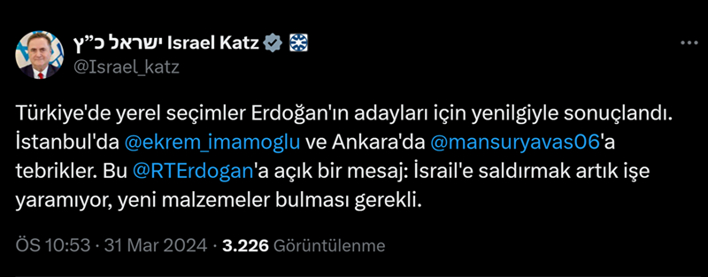 İşgalci İsrail'in Dışişleri Bakanı Yisrael Katz, CHP'nin İstanbul Büyükşehir Belediye (İBB) Başkanı Ekrem İmamoğlu ve Ankara Büyükşehir Belediye (ABB) Başkanı Mansur Yavaş'ı tebrik etti.