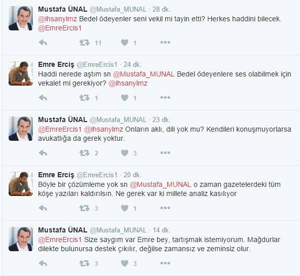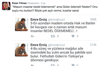 Örgüt lideri Gülen’in teslim olmaya çağırılmasının ardından FETÖ’cü troller saldırıya geçti. Erciş de kendisine hakaret edenlerin kredi kartı faturalarına kadar paylaşıp, yüksek harcamaların hesabını sordu. Bunun üzerine FETÖCÜ İhsan Yılmaz, Erciş’e “Yeni mahallende başarılar dilerim” diyerek örgütten kovulduğunu ima etti. Paralel Yapı’nın gazetesi Zaman’ın eski Ankara temsilcisi Mustafa Ünal da, Erciş’e ateş püskürdü. Gülen’in eleştirildiği tweetler karşısında çılgına dönen Ünal, “Bedel ödeyenler seni vekil mi tayin etti? Herkes haddini bilecek!” ifadelerini kullandı.