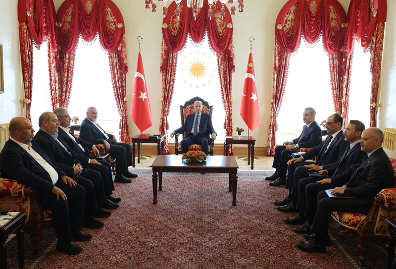 Görüşmede Cumhurbaşkanı Erdoğan'a Dışişleri Bakanı Hakan Fidan, Milli İstihbarat Teşkilatı Başkanı İbrahim Kalın, Cumhurbaşkanlığı İletişim Başkanı Fahrettin Altun, Cumhurbaşkanı Dış Politika ve Güvenlik Başdanışmanı Büyükelçi Akif Çağatay Kılıç ve Cumhurbaşkanı Başdanışmanı Sefer Turan eşlik etti.