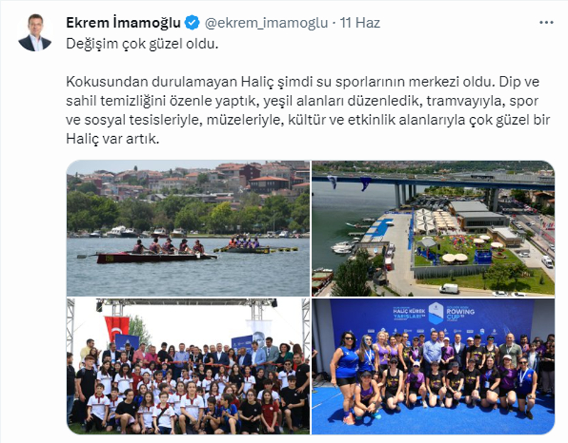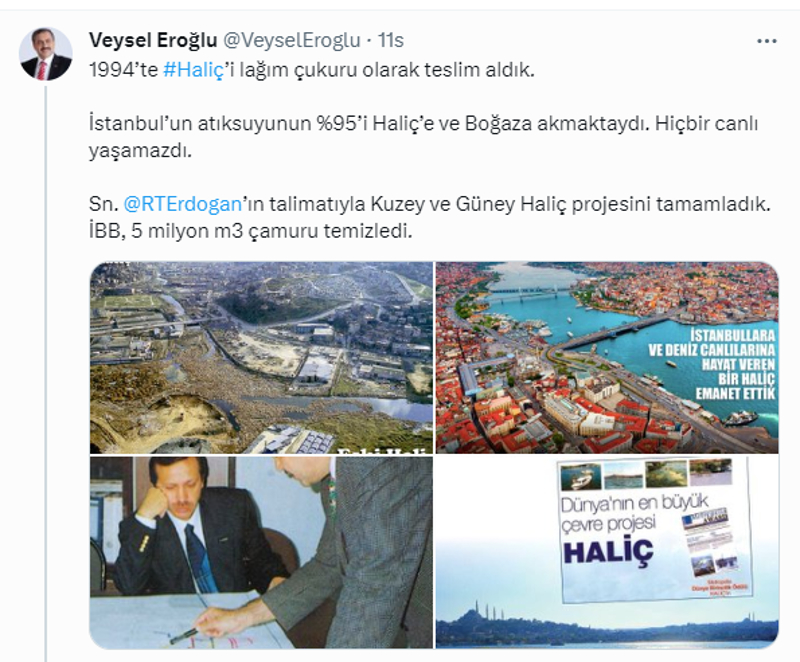 "1994'te Haliç'i lağım çukuru olarak teslim aldık. İstanbul'un atık suyunun %95'i Haliç'e ve boğaza akmaktaydı. Hiçbir canlı yaşamazdı, Sayın Recep Tayyip Erdoğan'ın talimatıyla Kuzey ve Güney Haliç projesini tamamladık. İBB, 5 milyon m3 çamuru temizledi."