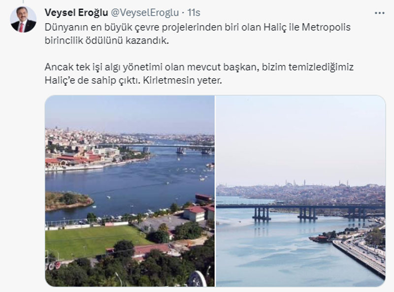 Dünyanın en büyük çevre projelerinden biri olan Haliç ile Metropolis birincilik ödülünü kazandığını söyleyen Eroğlu, "Ancak tek işi algı yönetimi olan mevcut başkan, bizim temizlediğimiz Haliç'e de sahip çıktı. Kirletmesin yeter." dedi.