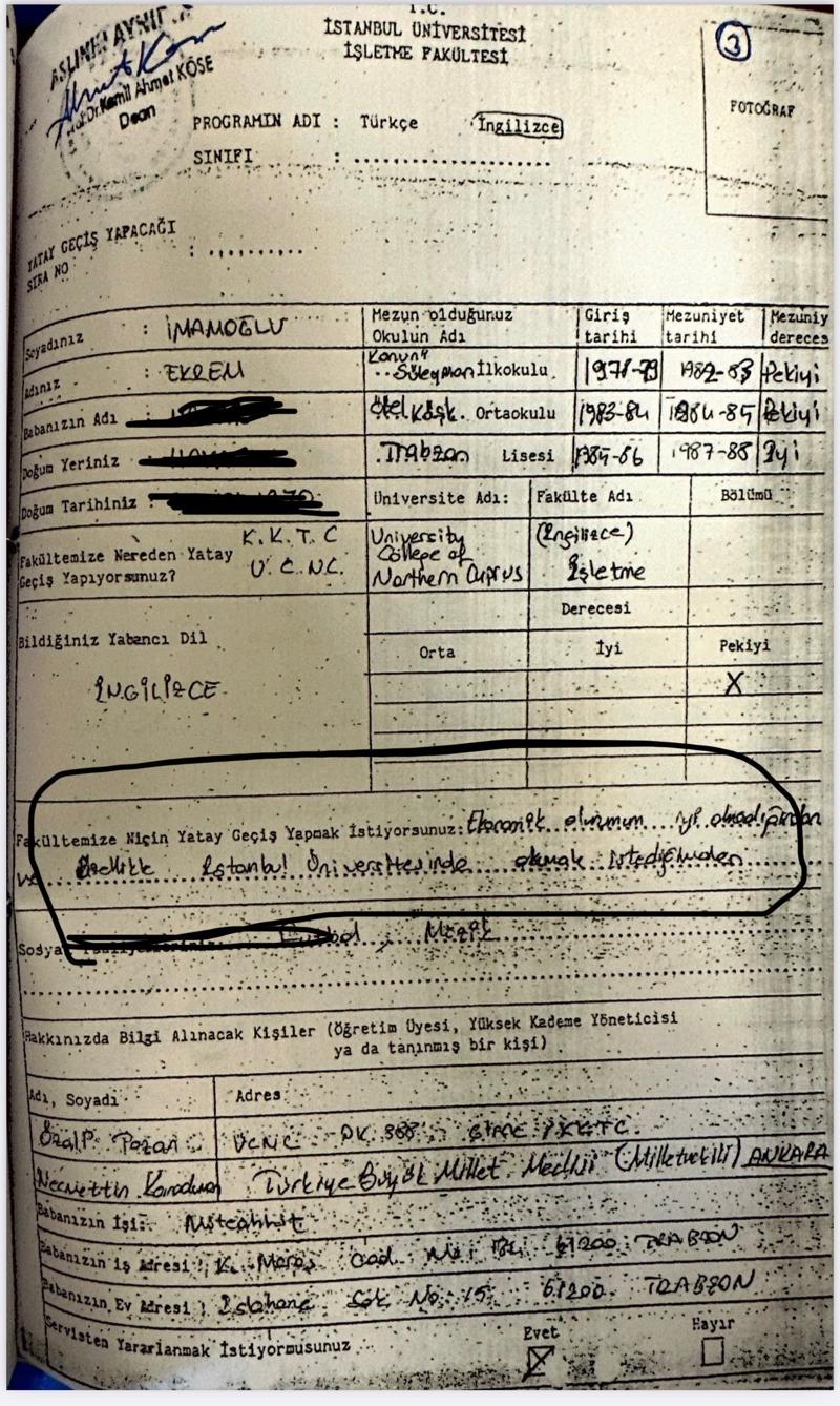 İBB Başkanı İmamoğlu'nun İstanbul Üniversitesinde gördüğü öğrenime ilişkin tüm belgelerin onaylı suretinin gönderilmesini isteyen Başsavcılık, 12 Eylül 1990'da yatay geçişin kabulüne ilişkin iş ile işlemlerin kim ve kimler tarafından ihdas edildiğinin tespiti ve bu kişilerin açık kimlik bilgilerini talep etmişti.