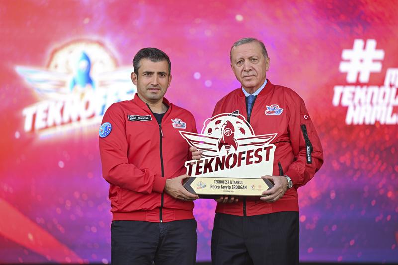 Cumhurbaşkanı Erdoğan festivale, üzerinde Türk bayrağı, Cumhurbaşkanlığı forsu ve soyadı bulunan TEKNOFEST montuyla katıldı.