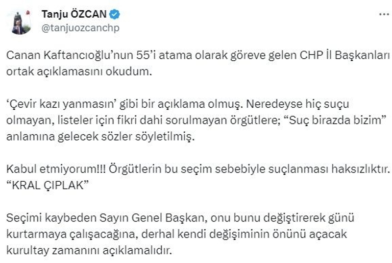Sosyal medya hesabından paylaşımda bulunan Özcan, Kılıçdaroğlu'na tepki gösterdiği mesajında, "Canan Kaftancıoğlu'nun 55'i atama olarak göreve gelen CHP İl Başkanları ortak açıklamasını okudum. 'Çevir kazı yanmasın' gibi bir açıklama olmuş. Neredeyse hiç suçu olmayan, listeler için fikri dahi sorulmayan örgütlere; 'Suç birazda bizim' anlamına gelecek sözler söyletilmiş. Kabul etmiyorum!!! Örgütlerin bu seçim sebebiyle suçlanması haksızlıktır. 'KRAL ÇIPLAK' Seçimi kaybeden Sayın Genel Başkan, onu bunu değiştirerek günü kurtarmaya çalışacağına, derhal kendi değişiminin önünü açacak kurultay zamanını açıklamalıdır." ifadesini kullandı.
