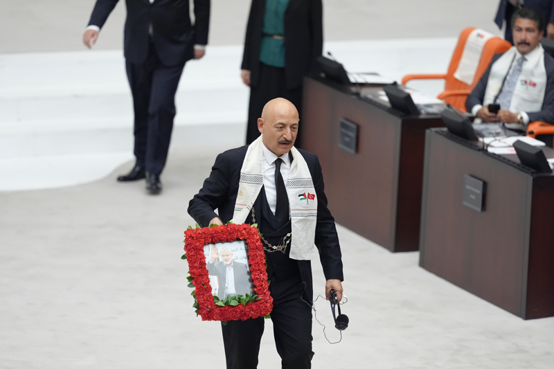 İran'da suikasta uğrayan Hamas Siyasi Büro Başkanı İsmail Heniyye'nin fotoğrafı salona getirildi.