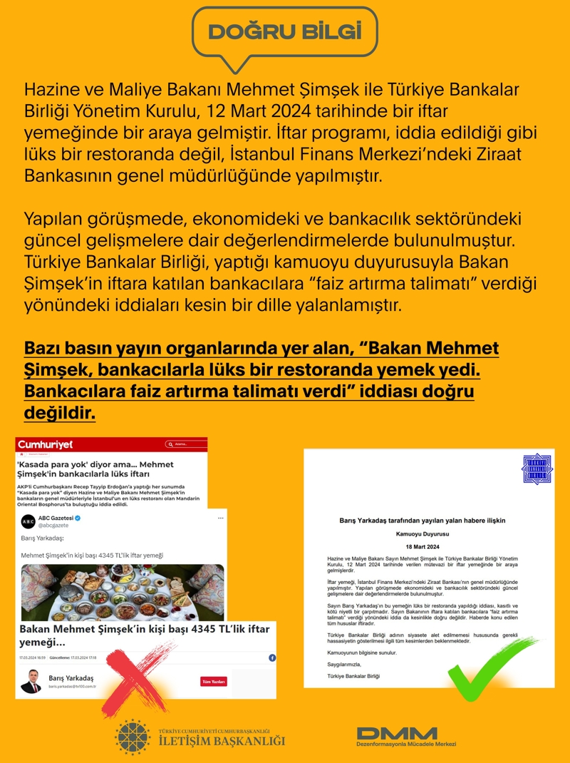 Merkezden yapılan açıklamada, "'Bakan Mehmet Şimşek, bankacılarla lüks bir restoranda yemek yedi. Bankacılara faiz artırma talimatı verdi' iddiası doğru değildir." bilgisine yer verildi.