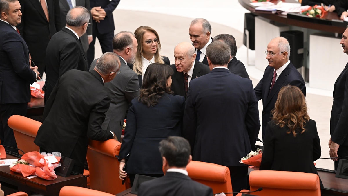 Bahçeli, bir gazetecinin yeni yasama yılının açılışında DEM Parti yöneticileriyle tokalaşmasına ilişkin sorusu üzerine, "Yeni bir döneme giriyoruz, dünyada barışı isterken kendi ülkemizde barışı sağlamamız lazım." karşılığını vermişti.