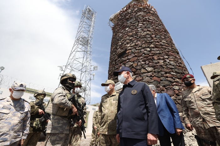 Buradan helikopterle sınır hattı boyunca incelemelerde bulunan Akar ve komutanlar daha sonra sıfır noktasındaki 2 bin 618 rakımlı Kocaçukur Tepe gözetleme mevzisine gitti.