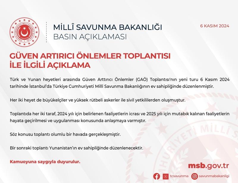 Milli Savunma Bakanlığı (MSB), Türkiye ile Yunanistan arasındaki Güven Artırıcı Önlemler (GAÖ) Toplantısı'nın bugünkü turunda, tarafların bu yıl için belirlenen faaliyetlerin icrası ve 2025 için mutabık kalınan faaliyetlerin hayata geçirilmesi ve uygulanması konusunda anlaşmaya vardığını bildirdi.