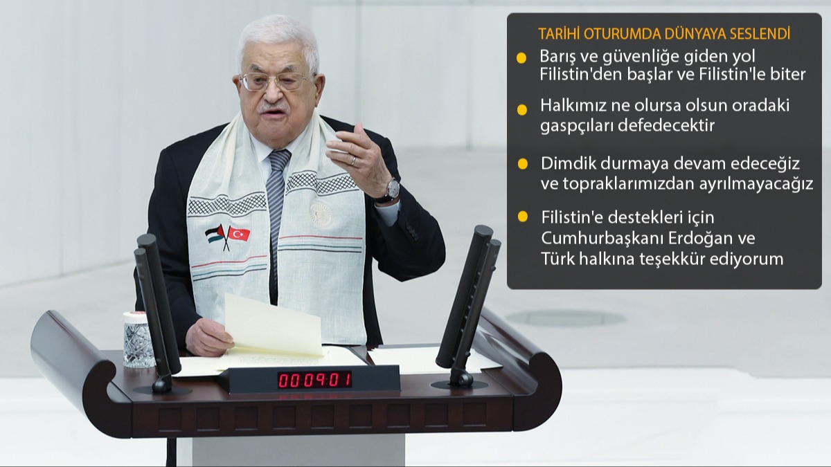 Abbas, TBMM'ye hitaben yaptığı konuşmada, Cumhurbaşkanı Recep Tayyip Erdoğan'ın liderliğindeki Türkiye'nin Filistin halkının meşru haklarını savunan duruşunu takdir ettiğini belirtti.
