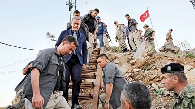 Milli Savunma Bakanı Hulusi Akar ve TSK komuta kademesi, yeni görevlerini sınırın sıfır noktasında Mehmetçikle birlikte kutladı. Teröristlerin bir dönem “Türk askerinin giremeyeceğini” iddia ettiği, Çukurca Dağbaşı Üs Bölgesi’ne komutanlarla giden Akar, “Çok şükür yukarıdan aşağı süpüre süpüre bu alçak teröristleri hudutlarımızın dışına attık, teröristleri takibe devam ediyoruz” dedi. Akar, Genelkurmay Başkanı Orgeneral Yaşar Güler, Kara Kuvvetleri Komutanı Orgeneral Ümit Dündar, Hava Kuvvetleri Komutanı Orgeneral Hasan Küçükakyüz ve Deniz Kuvvetleri Komutanı Koramiral Adnan Özbal ile yurtiçindeki ilk ziyaretini sınır birliklerine yaptı. Akar, 3. Piyade Tümen Komutanlığı harekat merkezinde teröristle mücadele operasyonlarına ilişkin bilgi aldı, direktifler verdi. Akar ve komutanlar daha sonra helikopterlerle, teröristlerce “girilemez” olarak nitelendirilen Çukurca’daki 2 bin 270 rakımlı Dağbaşı Üs Bölgesi’ne gitti.