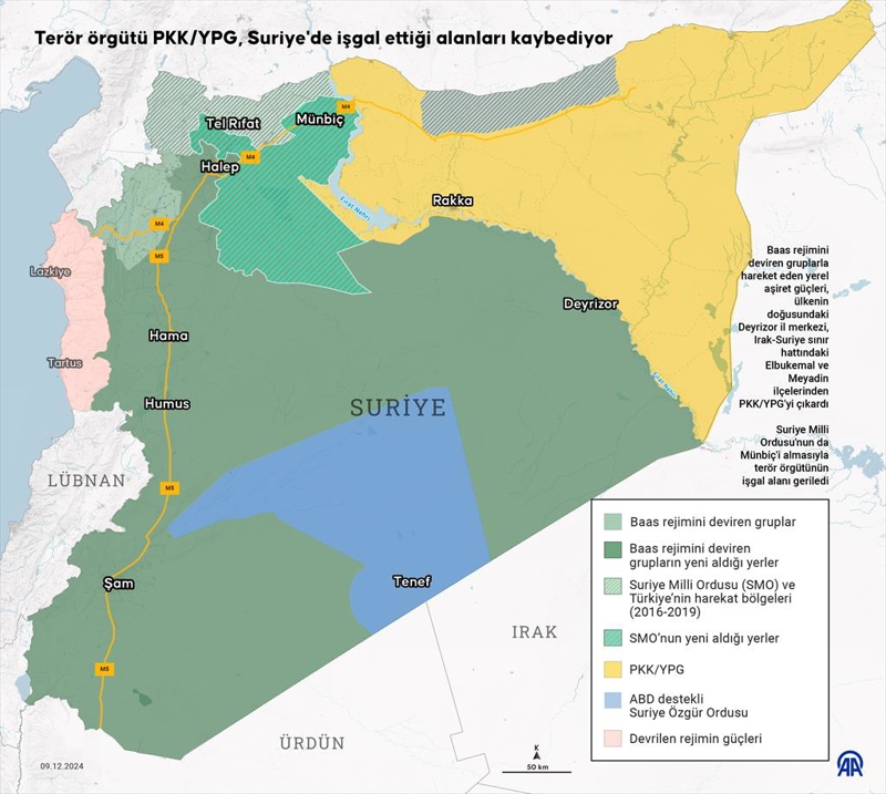 ABD'nin ise DEAŞ'la mücadele adı altında desteklediği ve Suriye'nin bölünmesiyle zemin bulan terör örgütü PKK/YPG'yi destekleme politikası iflas etti. Tarihsel olarak da terör örgütünün en yakın müttefiklerinden olan Esed rejiminin yıkılması ve yerine tüm Suriye'yi özgürleştirme iddiasındaki muhaliflerin gelmesi, YPG terörünün hem kuzeyden Türkiye ve SMO hem de güneyden yeni yönetim unsurları tarafından baskı altına alınacağı bir düzlem oluşturdu.