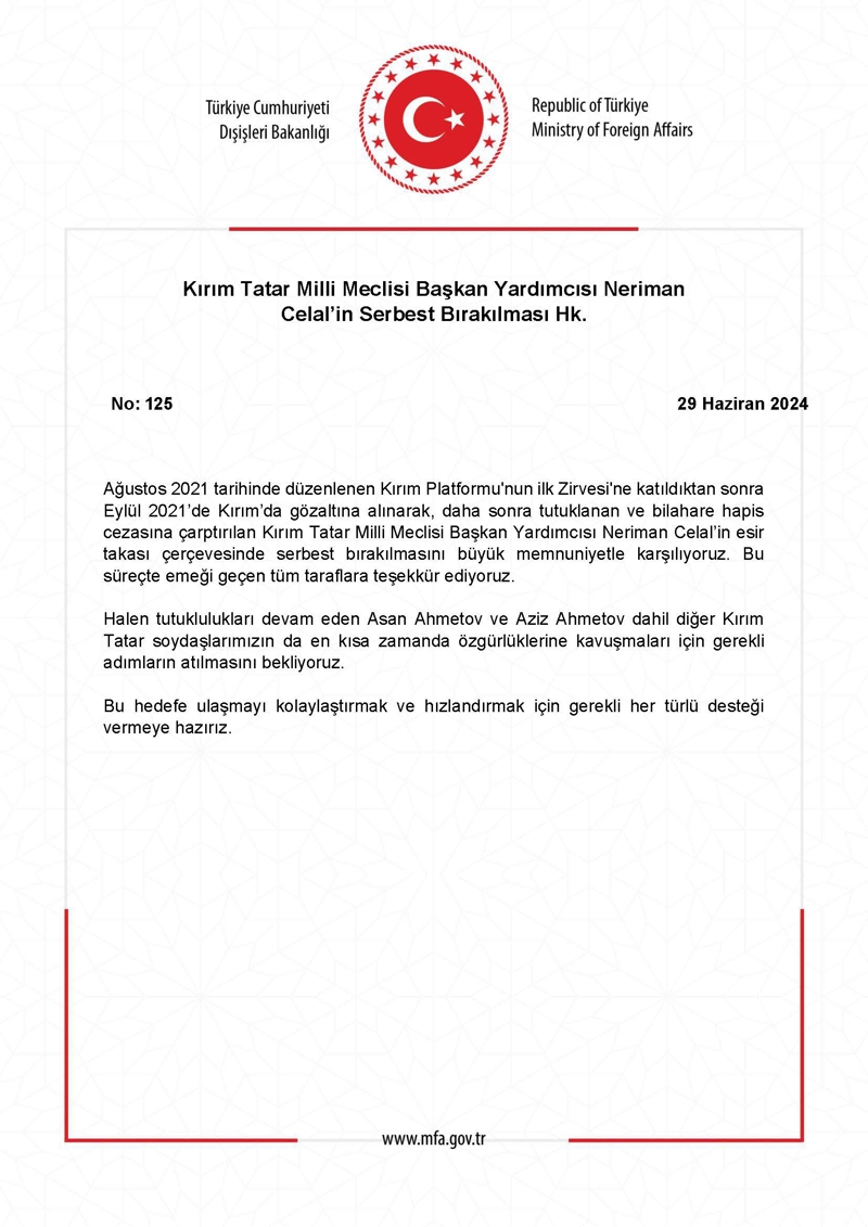 Dışişleri Bakanlığı, Kırım Tatar Milli Meclisi (KTMM) Başkan Yardımcısı Nariman Celal'in Rusya ile Ukrayna'nın anlaştığı takas sonucu serbest bırakılmasını memnuniyetle karşıladı.