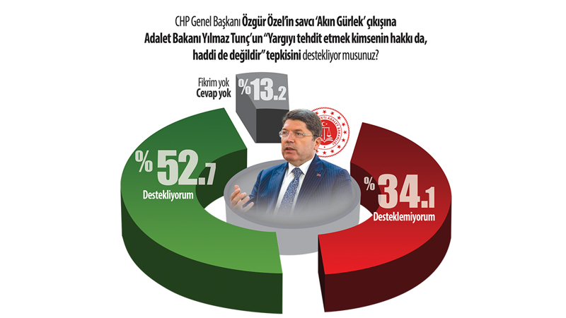 Ankette Özgür Özel'in savcı 'Akın Gürlek' çıkışına Adalet Bakanı "Yargıyı tehdit etmek kimsenin hakkı da, haddi de değildir" çıkışına CHP'lilerden de destek geldi. Ankete katılanların yüzde 52,7'si Bakan Tunç'un tepkisini desteklerken yüzde 34,1'i destek vermedi. Bakan Tunç'u destekleyenlerin yüzde 53,6'sı CHP seçmeniydi.