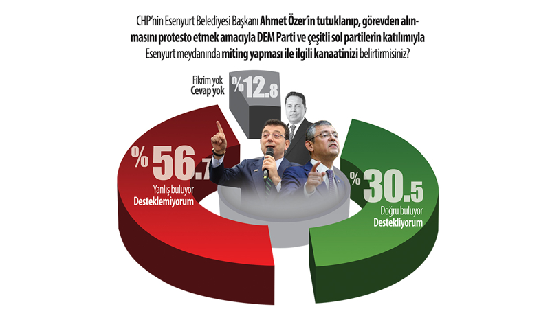 Betimar Araştırma tarafından 2-4 Kasım tarihleri arasında bin 514 kişiyle siyasi eğilimlerle ilgili bilgisayar destekli telefon anketi yapıldı. Akşam Gazetesi'nin haberine göre, "CHP'nin Esenyurt Belediye Başkanı Ahmet Özer'in tutuklanıp, görevden alınmasını protesto etmek amacıyla DEM Parti ve çeşitli sol partilerin katılımıyla miting yapması ile ilgili kanaatinizi belirtir misiniz?" sorusuna ankete katılanların yüzde 56,7'si 'yanlış buluyorum', yüzde 30,5'i ise "Doğru buluyorum" yanıtı verdi. DEM ile ortak mitingi yanlış bulanların yüzde 35,8'inin CHP seçmeni olması dikkat çekti. "Esenyurt mitingine Mansur Yavaş, Tanju Özcan ve Burcu Köksal gibi bazı CHP'li belediye başkanlarının katılmamasını doğru buluyor musunuz?" sorusuna yüzde 46,5'i 'doğru buluyorum yanıtını verdi.